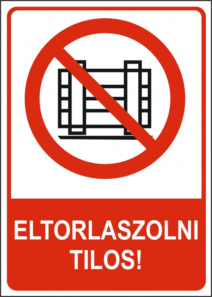 Eltorlaszolni tilos tábla piktogram. Folyosók, átjárók, menekülési útvonalak vagy vészkijárat eltorlaszolásának megelőzése érdekében lehet kihelyezni. Az így jelölt helyekre, területekre pakolni, rakodni, akadályt, torlaszt képezni tilos.