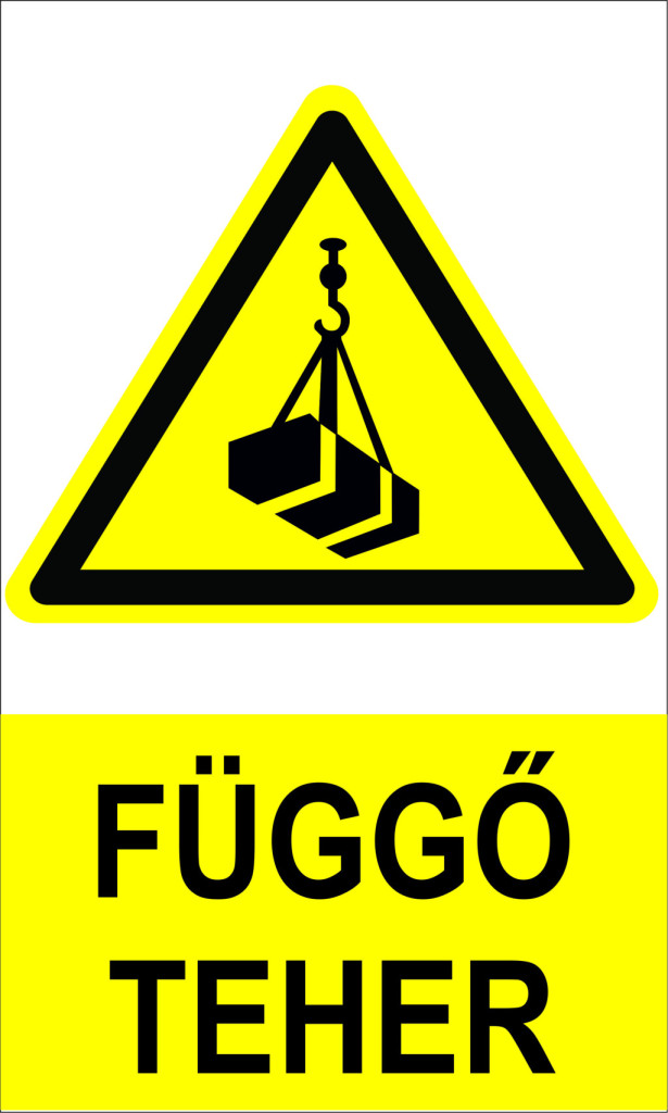 Egy munkavédelmi figyelmeztető jelzés, amely arra hívja fel a figyelmet, hogy a területen daruval vagy más emelőberendezéssel mozgatott, életveszélyes teher található, és tilos alatta tartózkodni. A tábla használatát jogszabályok írják elő az emelési munkálatok biztonsága érdekében.