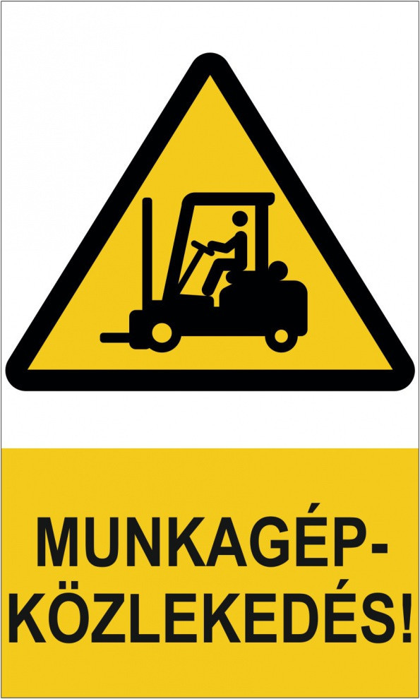 Munkagép közlekedés veszélyére figyelmeztető munkavédelmi jelzés. A közlekedési útvonalak jelölésére és munkagépek közlekedéséből adódó balesetekre figyelmeztető jelzés.
