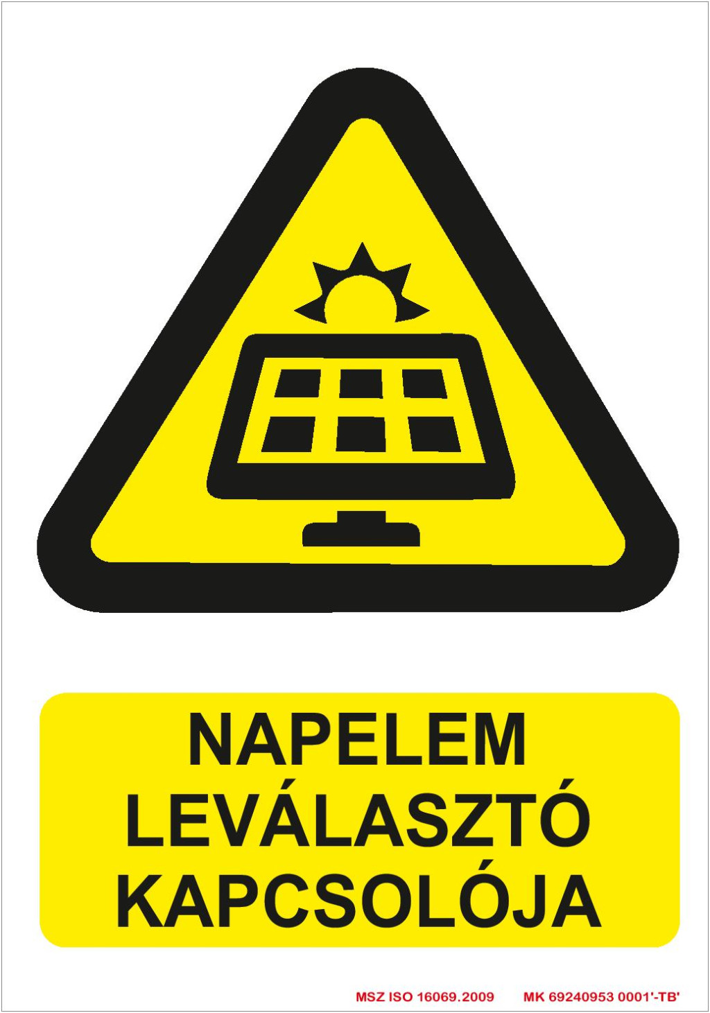 Az épület napelemes rendszerének leválasztó kapcsolójára hívja fel a figyelmet, és kötelezően alkalmazandó a főkapcsoló, az inverter vagy az elosztószekrény közelében; ez a jelzés segíti a fotovillamos rendszer gyors és egyértelmű áramtalanítását karbantartás, hibaelhárítás vagy tűzvédelmi beavatkozás esetén.