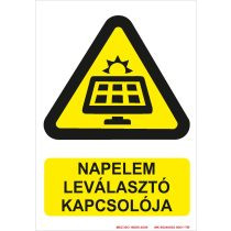 Az épület napelemes rendszerének leválasztó kapcsolójára hívja fel a figyelmet, és kötelezően alkalmazandó a főkapcsoló, az inverter vagy az elosztószekrény közelében; ez a jelzés segíti a fotovillamos rendszer gyors és egyértelmű áramtalanítását karbantartás, hibaelhárítás vagy tűzvédelmi beavatkozás esetén.
