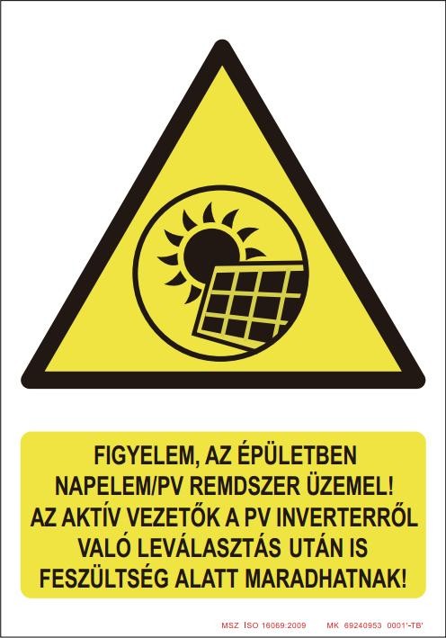 UV tábla - Figyelem az épületben napelem működik. - felirat piktogrammal