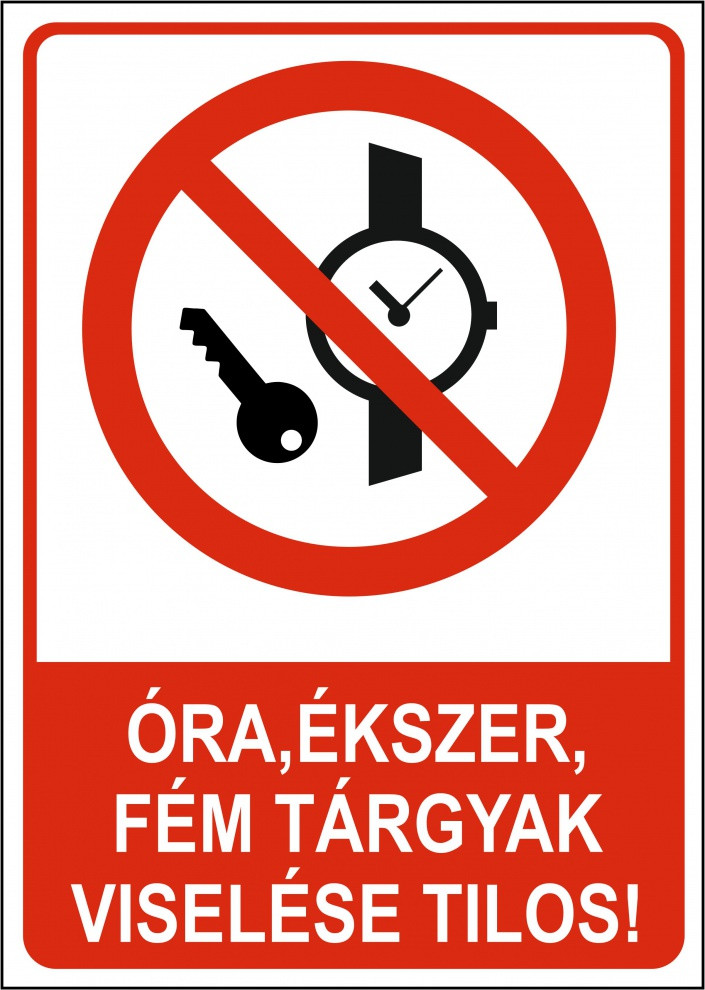 Az "Óra, ékszer, fémtárgyak viselése tilos" jelzés azt jelenti, hogy az adott területen (pl. üzemek, gyártósorok, laborok, vagy veszélyes gépek közelében) egészségvédelmi vagy biztonsági okokból, különösen elektromágneses térben vagy forgó alkatrészek közelében, nem szabad fémtárgyakat (karórát, nyakláncot, gyűrűt, karkötőt) viselni, mert balesetet okozhatnak, beszorulhatnak, vagy veszélyes kölcsönhatásba léphetnek.